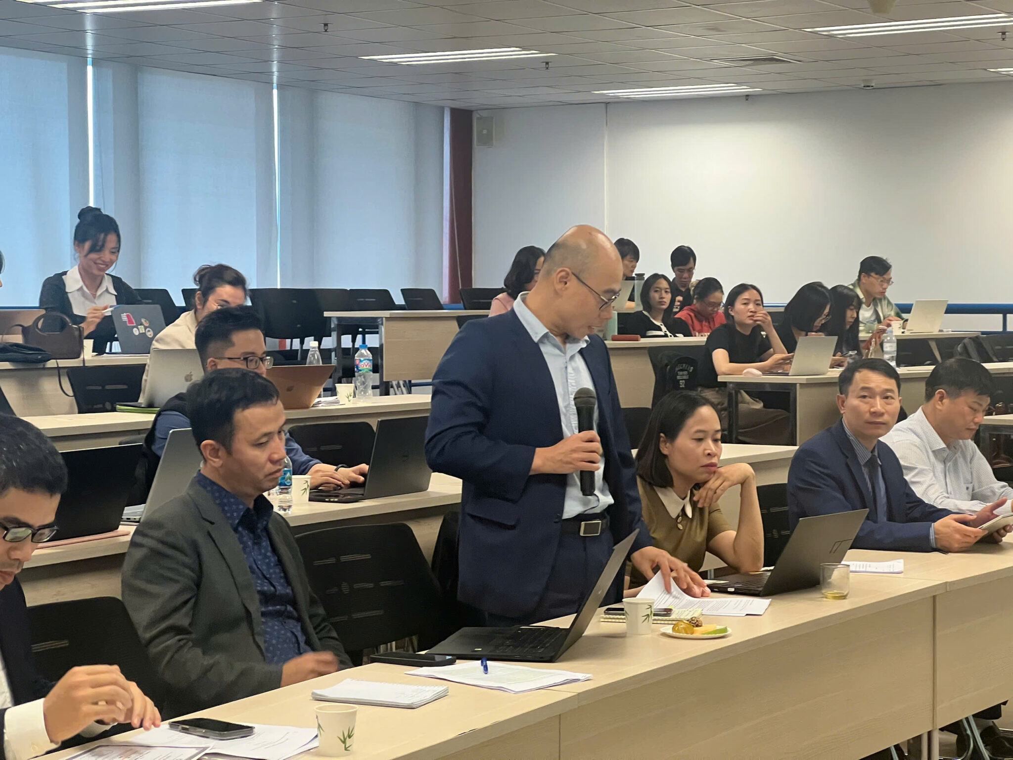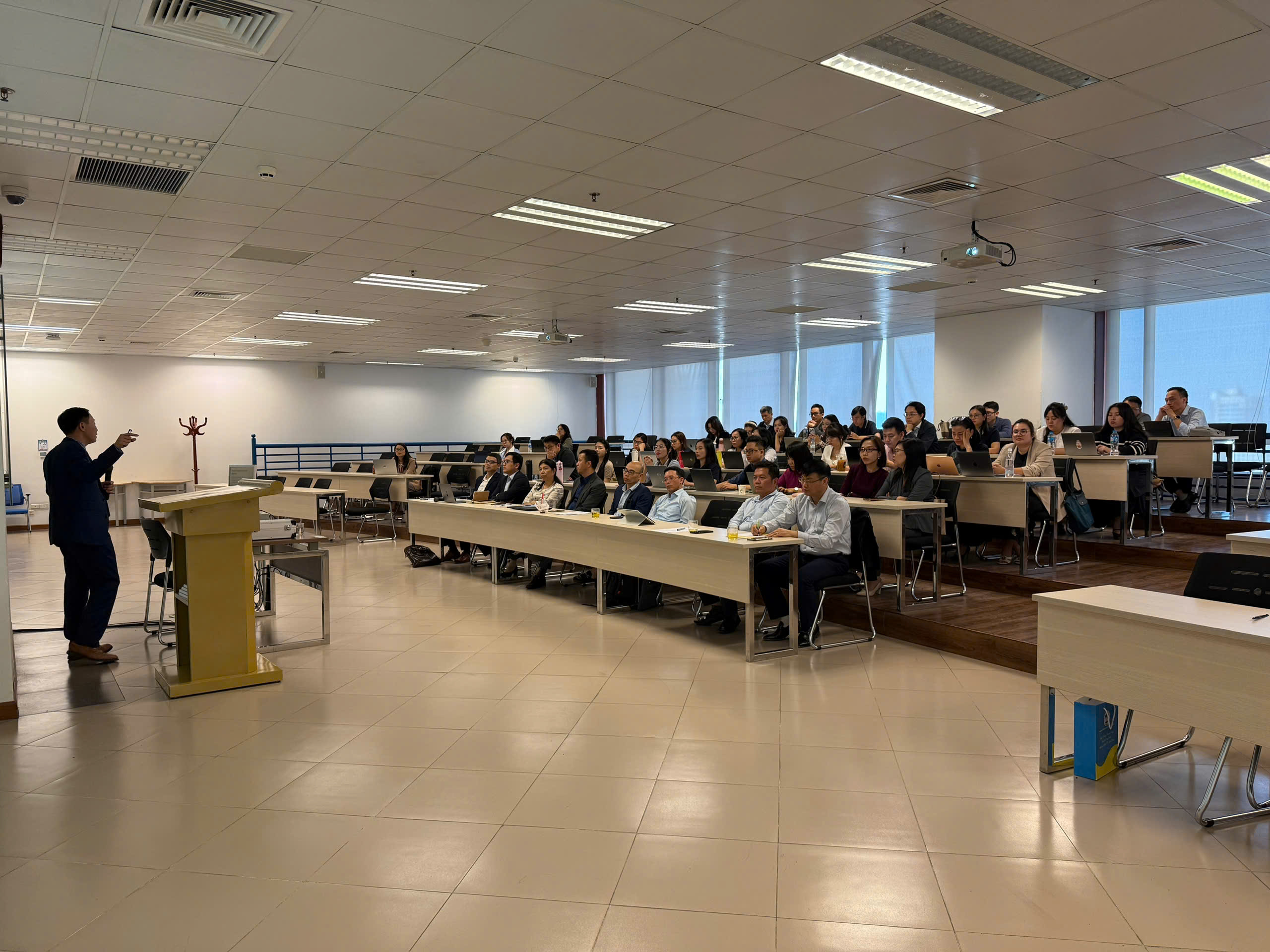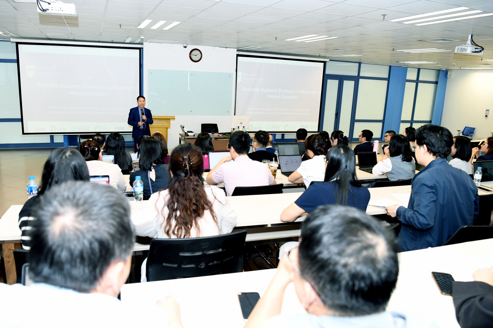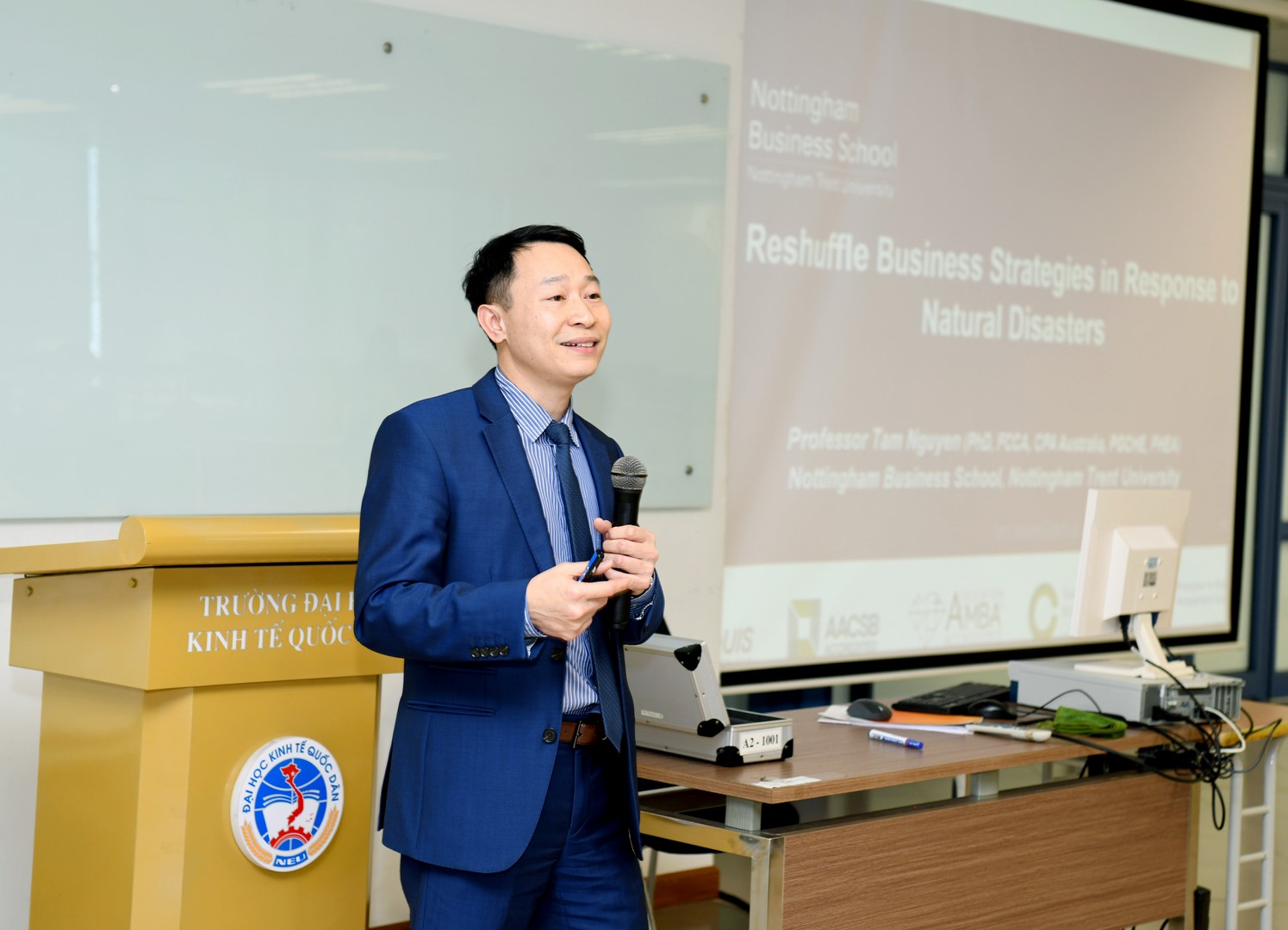 Trong phần báo cáo chính, GS.TS. Tam Nguyen đến từ Trường Kinh doanh Nottingham, Đại học Nottingham Trent (Vương quốc Anh) đã trình bày tham luận với chủ đề “Reshuffle Business Strategies in Response to Natural Disasters”. Dưới sự điều phối của PGS.TS. Bạch Ngọc Thắng (NEU), bài trình bày mang đến những phân tích sâu sắc về khả năng tái cấu trúc chiến lược kinh doanh trong bối cảnh thiên tai, biến đổi khí hậu và những thách thức toàn cầu.