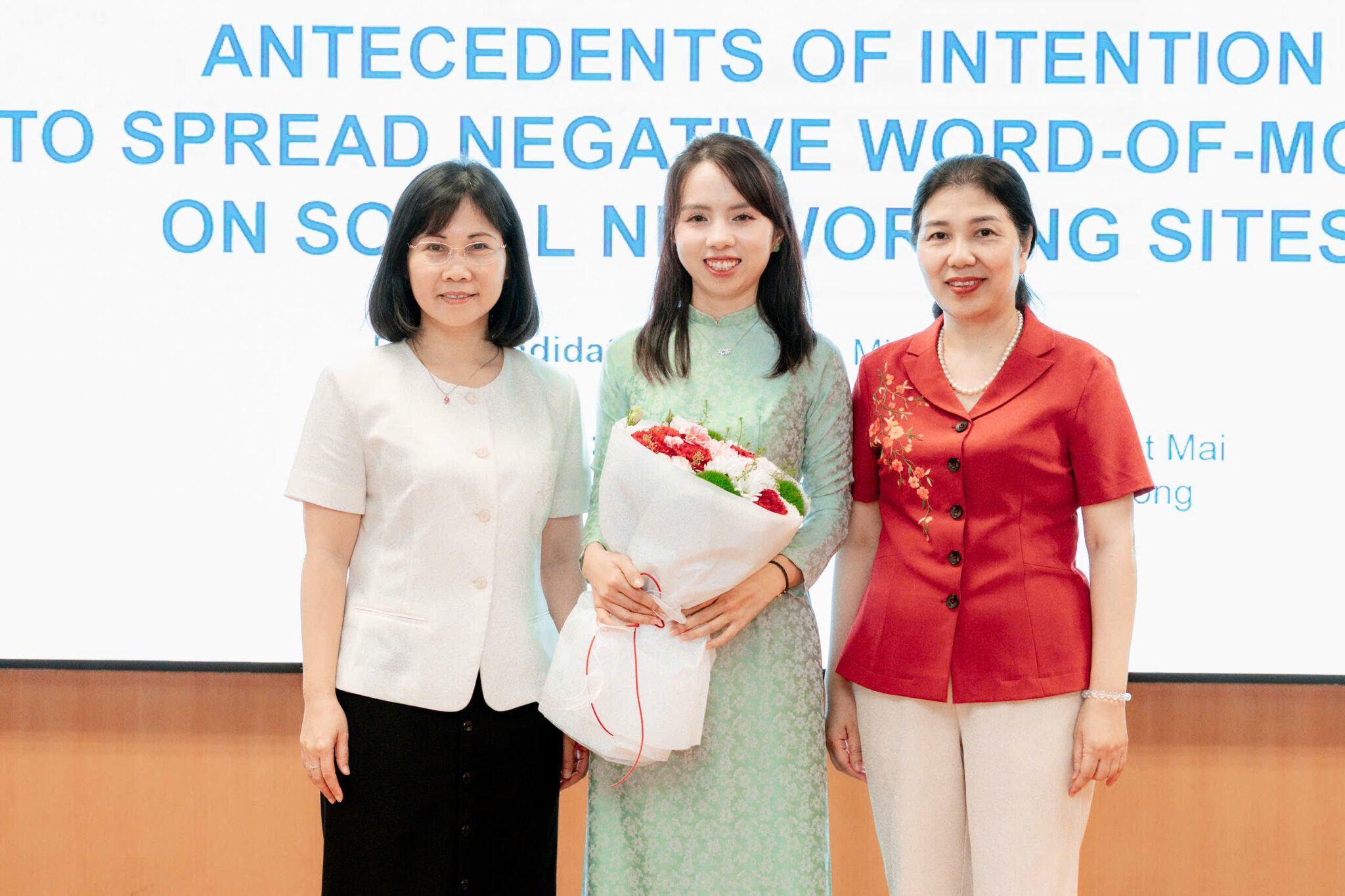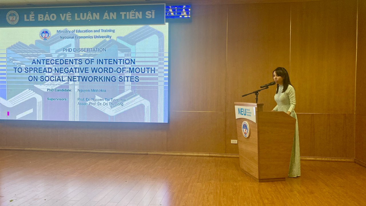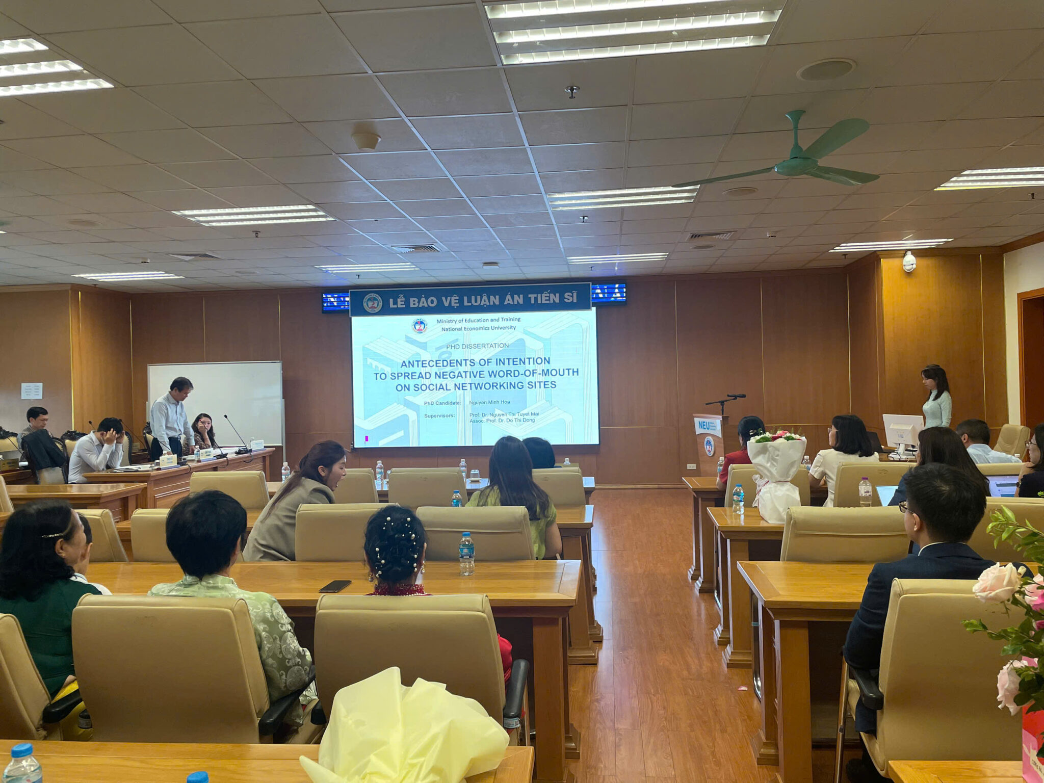 Chiều ngày 14/04/2026, tại Đại học Kinh tế Quốc dân (NEU) đã tổ chức Lễ bảo vệ luận án tiến sĩ cho nghiên cứu sinh Hội đồng đánh giá luận án tiến sĩ cấp trường đã tổ chức buổi bảo vệ luận án tiến sĩ cho nghiên cứu sinh Nguyễn Minh Hoà chuyên ngành Economics (E-PhD), mã số 9310101. Luận án có tiêu đề: “Antecedents of intention to spread negative word-of-mouth on social networking sites”.
