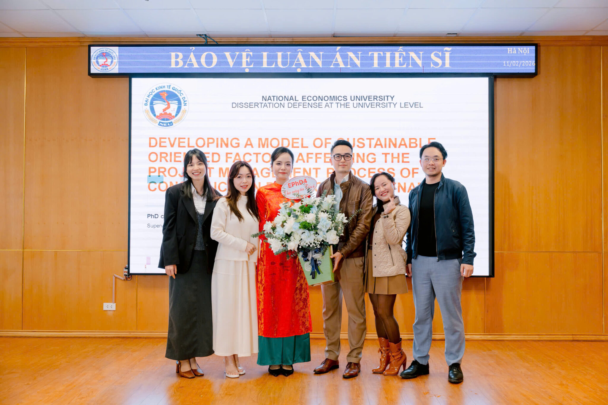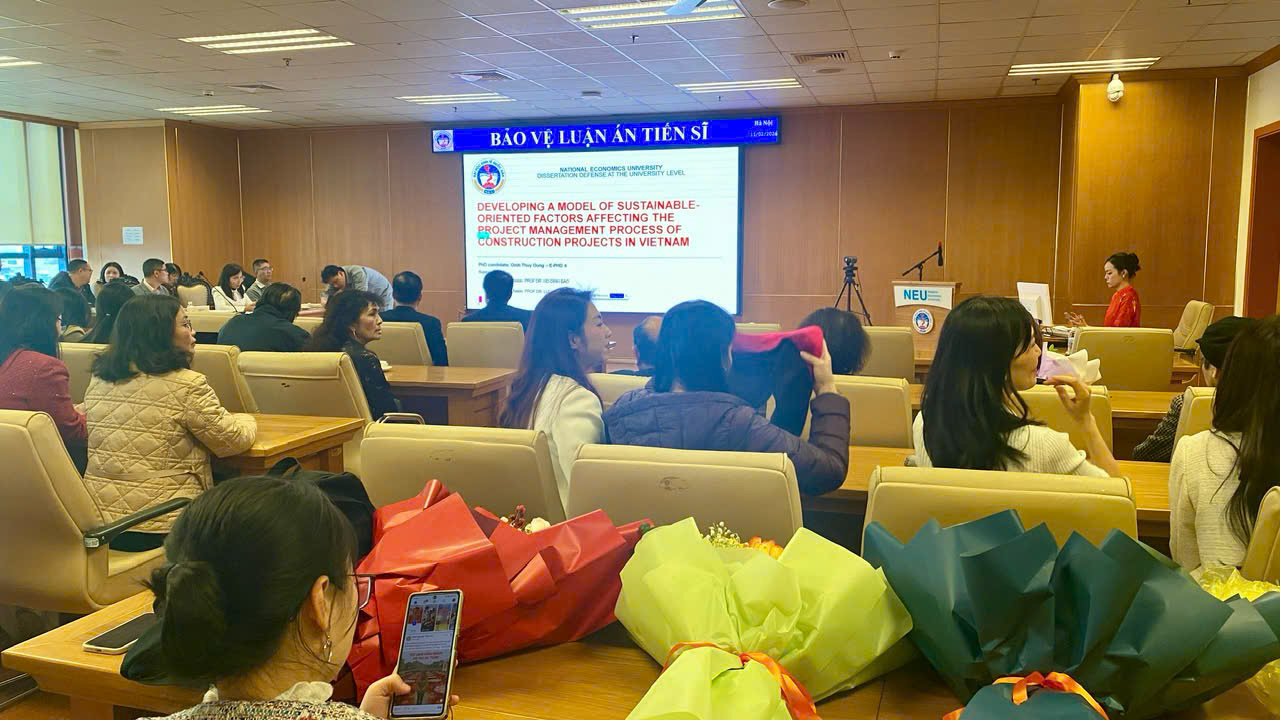 Chiều 11/02/2026, Đại học Kinh tế quốc dân (NEU) đã tổ chức Lễ bảo vệ luận án tiến sĩ cho nghiên cứu sinh Đinh Thuỳ Dung, chuyên ngành Quản trị Kinh doanh (chương trình tiến sỹ bằng tiếng Anh) với đề tài luận án: “Developing a model of sustainable-oriented factors affecting the project management process of construction projects in Vietnam”