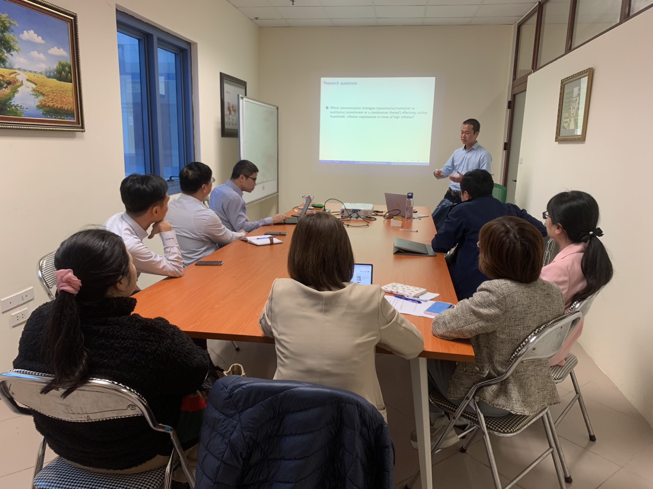 Tại buổi toạ đàm, khách mời Giang Nghiêm chia sẻ về nghiên cứu tìm hiểu các chiến lược truyền thông nhằm neo giữ kỳ vọng lạm phát trung hạn của các hộ gia đình trong môi trường lạm phát cao. Nghiên cứu đã tiến hành một thử nghiệm ngẫu nhiên có kiểm soát (RCT) với mẫu đại diện gồm 4.000 người tiêu dùng Đức vào đầu năm 2023, với các phương pháp xử lý thông tin bao gồm tuyên bố định tính của chủ tịch ECB và thông tin định lượng về mục tiêu lạm phát của ECB cũng như về lạm phát dự kiến. Kết quả của nghiên cứu cho thấy rằng dự báo lạm phát là hiệu quả nhất, nhưng việc kết hợp thông tin về mục tiêu lạm phát với một tuyên bố định tính cũng cải thiện đáng kể việc neo đậu. Hiệu quả điều trị đặc biệt rõ rệt ở những người trả lời có trình độ hiểu biết tài chính cao và tin tưởng cao vào ngân hàng trung ương.